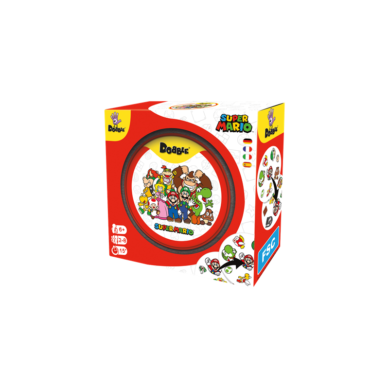 Sencillo, rápido y divertido: ¡Dobble es el juego definitivo de observación y velocidad! Encuentra antes que nadie el único símbolo idéntico entre 2 cartas para ganar una carta o librarte de ella. Encuentra los personajes y objetos más emblemáticos del famoso videojuego Super Mario en 55 cartas ilustradas.